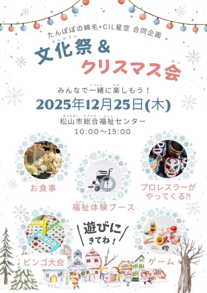 12月25日㈭10:00~15:00、松山市総合福祉センター1階にて、文化祭&クリスマス会を実施します。