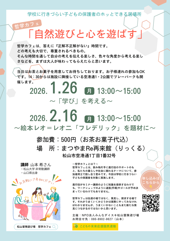 哲学カフェとは、飲み物⽚⼿に進⾏役のサポートのもと、私たちの暮らしや社会に関わるテーマについて、参加者同⼠で話し合う営みです。今回は学校に行きづらい子どもの保護者を対象に実施します。