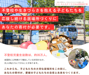 NPO法人みんなダイスキ松山冒険遊び場の代表をしている山本良子(やまもとよしこ)と申します。 私自身4人の子どもを育てる中で、社会は便利になりましたが、子育てはますます大変になっていると感じています。少子高齢化、核家族化 … 続きを読む 寄付・支援のお願い