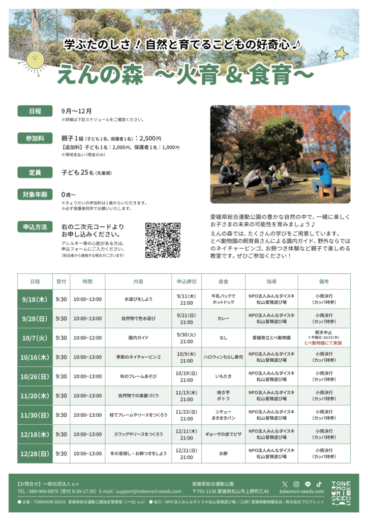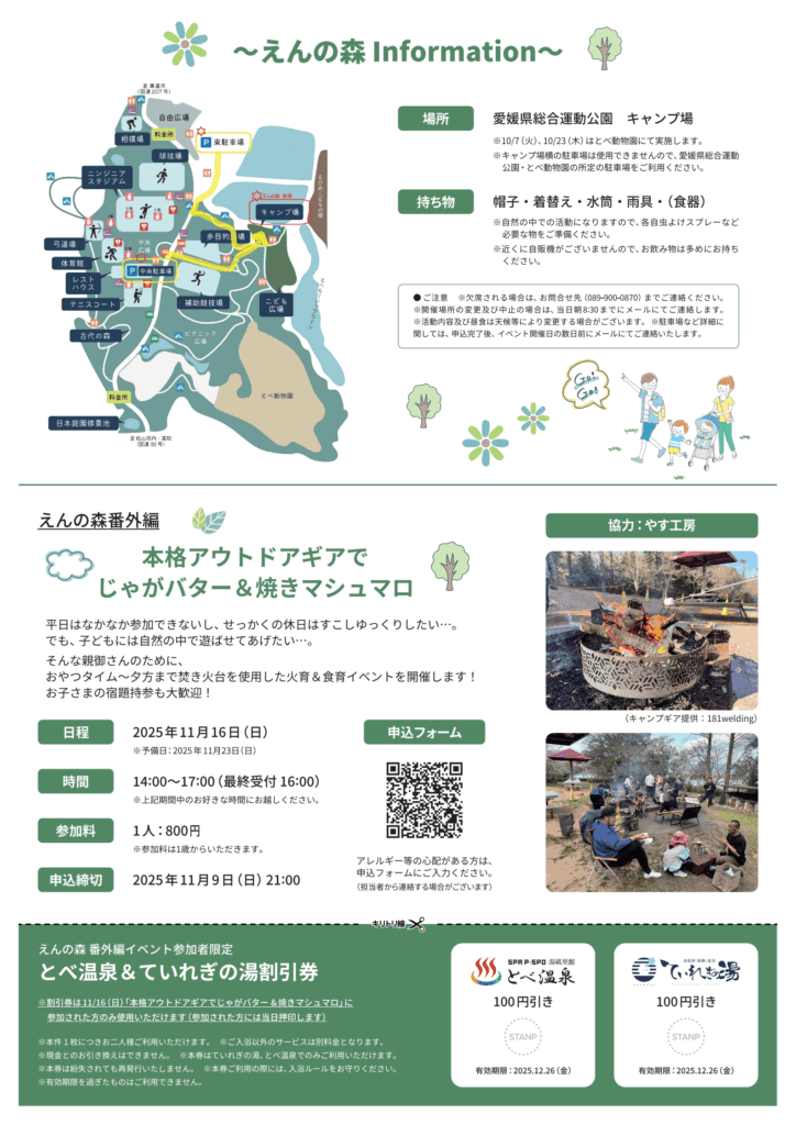 愛媛県総合運動公園の指定管理者であるTOBEMORI SEEDSさんの主催するイベントに今年度も協力させていただき、親子型森のようちえん「えんの森」を開催させていただきます。